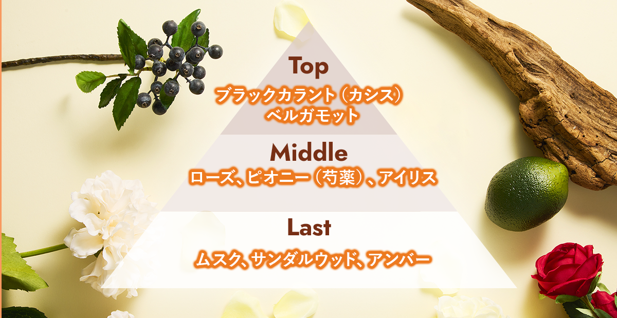 深みのあるアンバーに、優雅なローズが溶け合う、凛とした華やかさと大人の色気を感じさせる香り。
