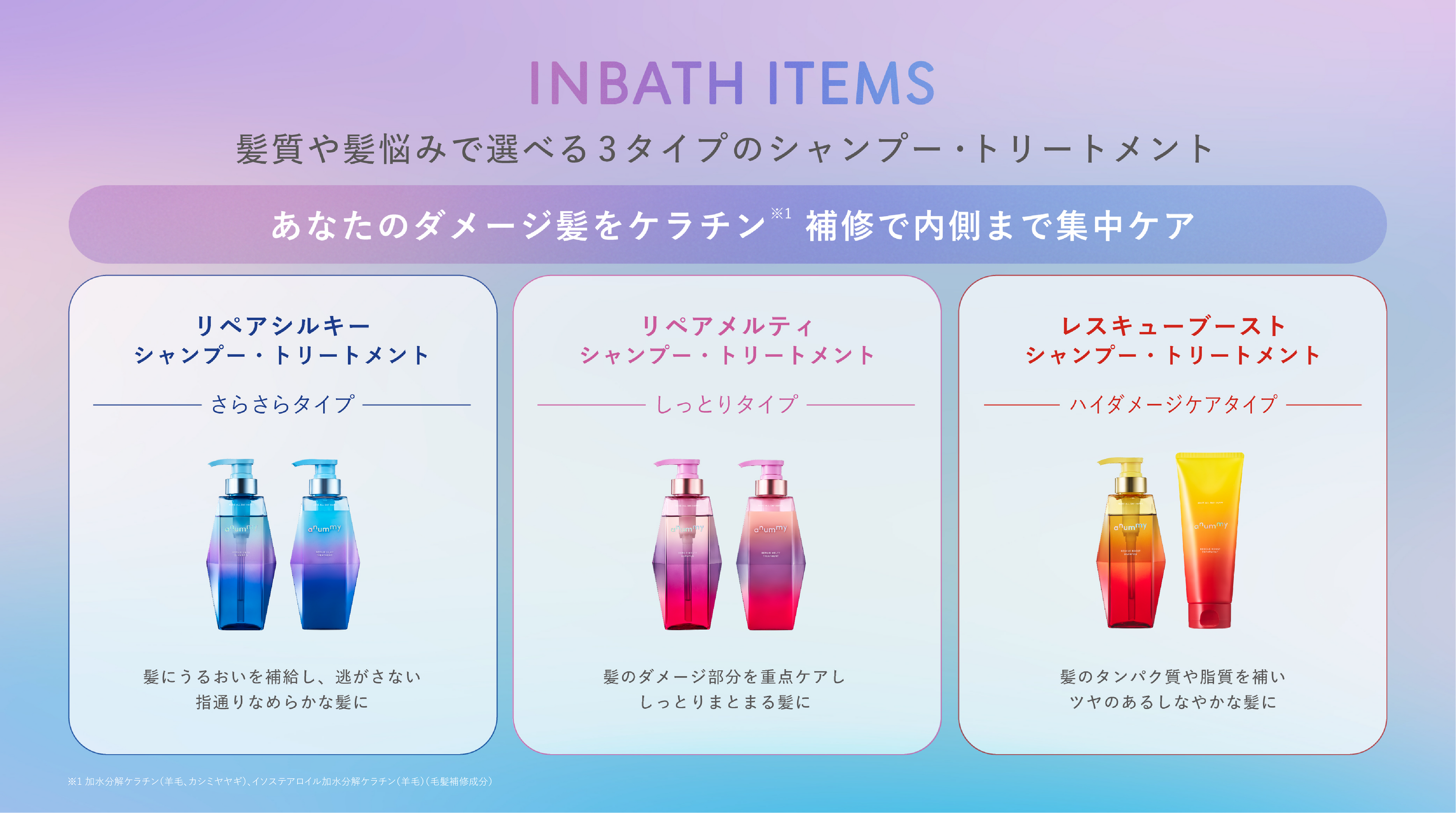 髪を伸ばす時間そのものを楽しむダメージヘアケアブランドとして、 2026年3月に誕生。カラーやブリーチ、日々の摩擦によるダメージに寄り添う処方設計で、髪質や髪悩みに応じた3タイプのシャンプー・トリートメントと、なりたい仕上がりに合わせて選べるアウトバスアイテムを展開しています。