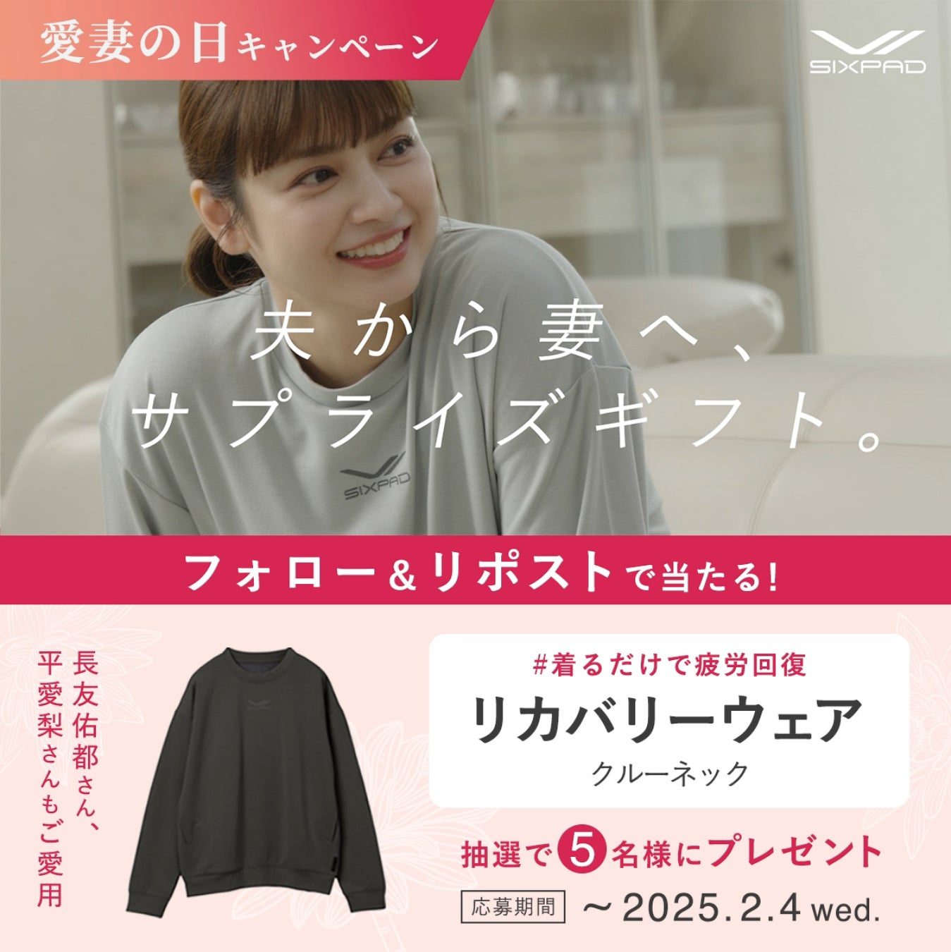さらに、SNSで参加できるキャンペーンとして、SIXPAD公式Xで「愛妻の日 Xリポストキャンペーン」を開催します。対象投稿をリポストすると、抽選で5名様にリカバリーウェアをプレゼントいたします。