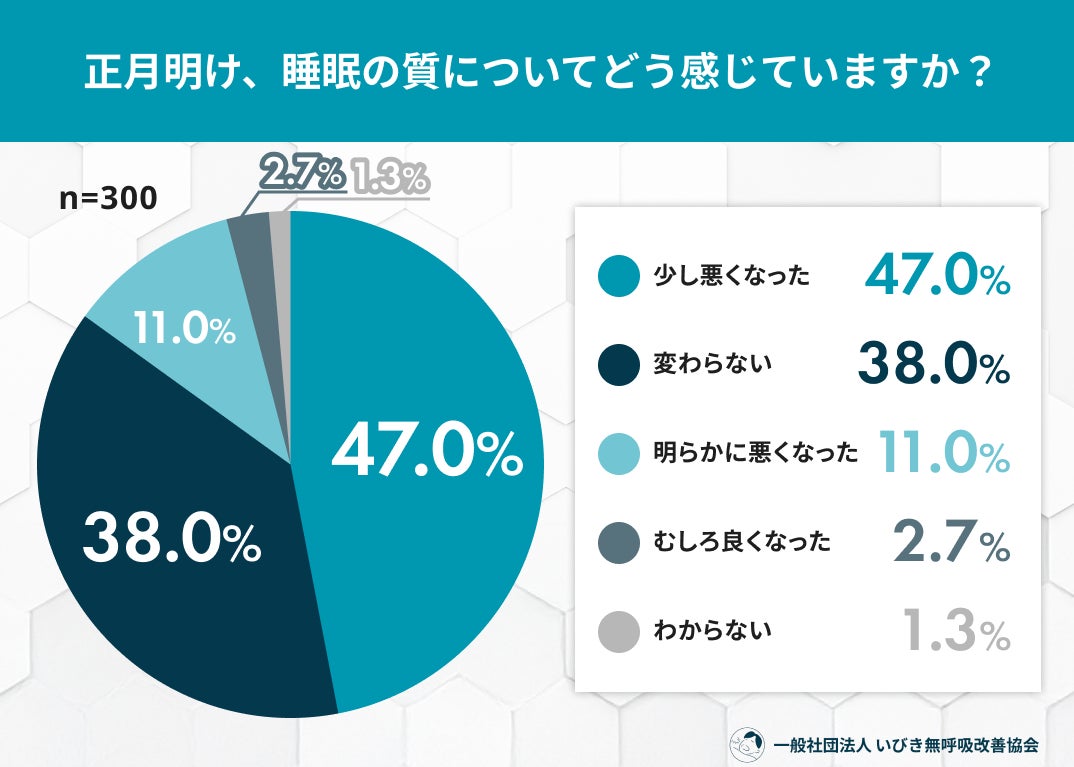 年末年始は、忘年会や新年会、夜更かし、食生活の乱れなど、日常とは異なる生活が続きやすい時期です。「正月明けに疲れが抜けない」「睡眠の質が落ちた気がする」と感じた人も多いのではないでしょうか。一般社団法人 いびき無呼吸改善協会では、年末年始に生活リズムが乱れた自覚のある20〜60代男女300名を対象に、「正月明けの睡眠といびき」に関する調査を実施しました。その結果、約6割が睡眠の質の低下を実感し、3人に1人以上が年末年始にいびきの変化を感じている実態が明らかになりました。年末年始の“ちょっとした生活習慣の乱れ”が、睡眠やいびきにどのような影響を及ぼしているのか、調査結果から読み解きます。