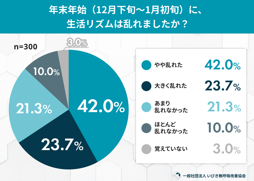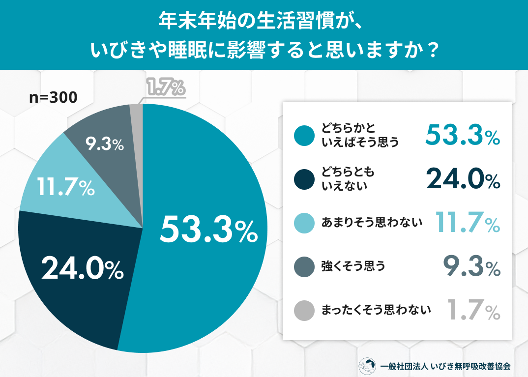 年末年始は、忘年会や新年会、夜更かし、食生活の乱れなど、日常とは異なる生活が続きやすい時期です。「正月明けに疲れが抜けない」「睡眠の質が落ちた気がする」と感じた人も多いのではないでしょうか。一般社団法人 いびき無呼吸改善協会では、年末年始に生活リズムが乱れた自覚のある20〜60代男女300名を対象に、「正月明けの睡眠といびき」に関する調査を実施しました。その結果、約6割が睡眠の質の低下を実感し、3人に1人以上が年末年始にいびきの変化を感じている実態が明らかになりました。年末年始の“ちょっとした生活習慣の乱れ”が、睡眠やいびきにどのような影響を及ぼしているのか、調査結果から読み解きます。