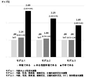 2016年10月から2023年10月までの追跡期間中、3,187人の研究参加者のうち277人が死亡しました。年齢と性別で調整した分析(図:モデル1)では、ベースライン時に「不幸である」と報告した参加者は、「幸福である」と報告した参加者に比べて、全死因死亡のリスクが約2.7倍高いことが示されました(オッズ比※5:2.69、95%信頼区間:1.63-4.44)。さらに、年齢、性別に加えて、教育歴、婚姻状況、経済状況といった社会経済的要因、BMIや身体機能といった健康状態を調整した分析(図:モデル3)においても、「不幸である」と報告した参加者の死亡のリスクは依然として統計学的に有意に高く(オッズ比:1.85、95%信頼区間:1.09-3.16)、この関連は変わりませんでした。また、追跡開始から1年以内に死亡した参加者を除外した感度分析においても、同様の傾向が確認されました。