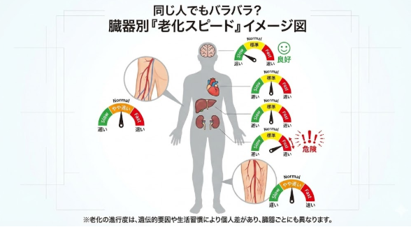 さらに興味深いのは、一人の人間の中でも「老化のスピード」は均一ではないという点です。スタンフォード大学などの研究によると、心臓、腎臓、肝臓、免疫系など、臓器やシステムごとに老化の進み具合が異なることが分かってきています。