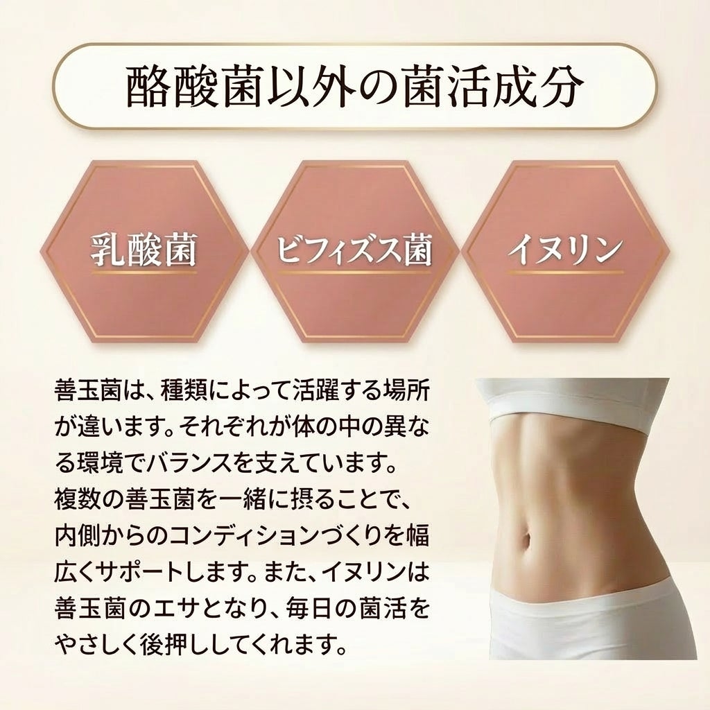 単なる栄養補給にとどまらず、内側から整える成分を配合。短鎖脂肪酸「酪酸」を作り出す酪酸菌は、体を内側から整えたい方に注目されている成分です。本製品では酪酸菌に加え、乳酸菌、ビフィズス菌、食物繊維を配合し、体内フローラを意識する方をサポートします。