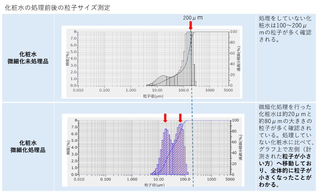 粒子径分布の測定において、従来の製法では100〜200µmであった粒子が、本製法を用いることで約20µmおよび約80µmのサイズへ大きく移動し、全体的に粒子が微細化されていることが確認されました。