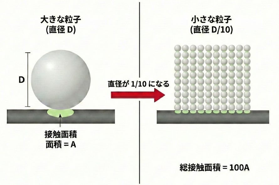 粒子を微細化することで、同じ成分量であっても肌に触れる総面積を大幅に増加させることが可能となります。一般的に、粒子の直径を10分の1に微細化すると、総接触面積は理論上約100倍にまで増加すると言われており、この原理をスキンケアに応用しました。