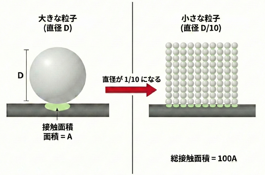 粒子を微細化することで、同じ成分量であっても肌に触れる総面積を大幅に増加させることが可能となります。一般的に、粒子の直径を10分の1に微細化すると、総接触面積は理論上約100倍にまで増加すると言われており、この原理をスキンケアに応用しました。