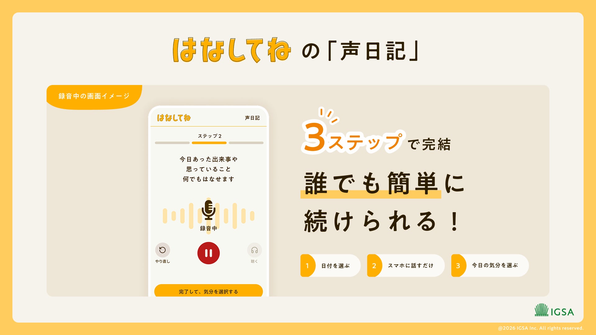 「声日記」は、たった3ステップで日記をつけられる新機能です。