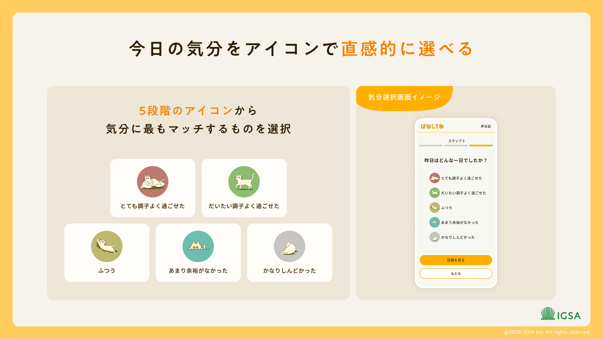 「昨日はどんな一日でしたか?」と聞かれたら、5段階の気分から選ぶだけ。猫のアイコンで直感的に選べるので、言葉にしにくい微妙な感情も記録できます。