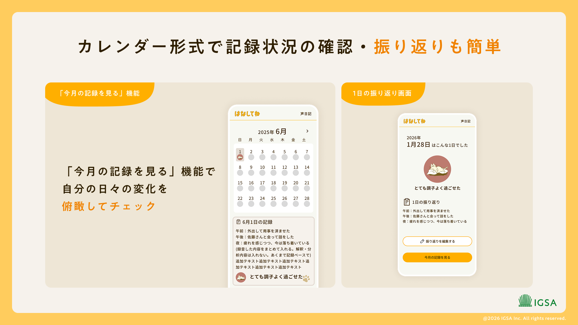 話した内容は自動的に文字に変換され、日付とともに保存されます。カレンダー形式で月間の記録状況が一目でわかり、過去の日記をタップするだけで簡単に振り返ることができます。「今月の記録を見る」機能で、自分の日々の変化を俯瞰することもできます。