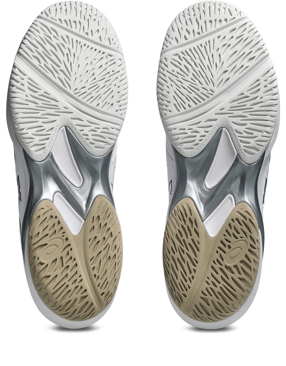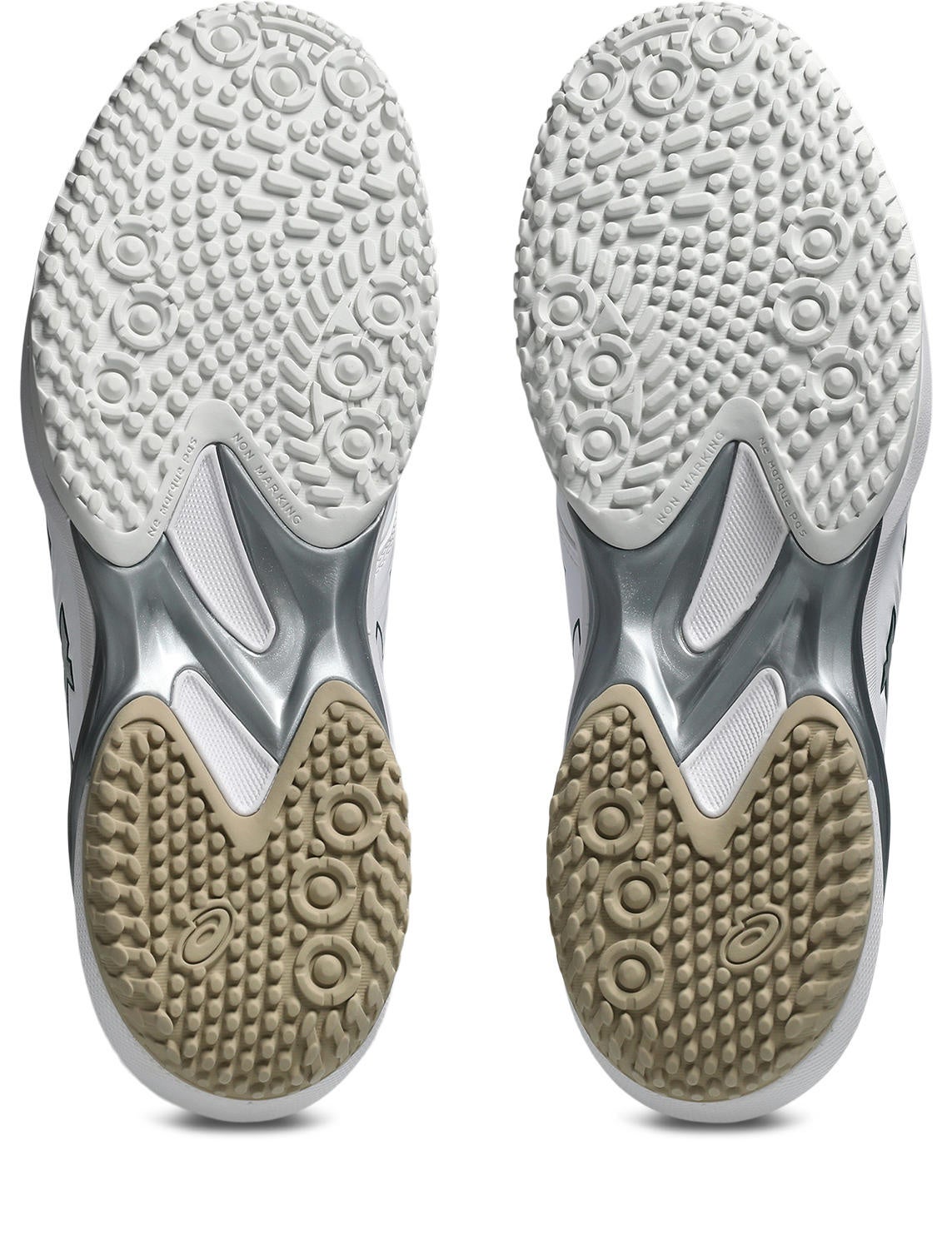 靴底は、プレーを支えるためのグリップ性を追求しています。オールコート用では、プレー中に力のかかる部分を考慮し、網目状の意匠にすることで、グリップ力と柔軟性をよりよいバランスで実現しています。オムニ・クレーコート用では、グリップ力を発揮させるため、意匠の形状と向きの検証を行い、適切な形に設計しています。