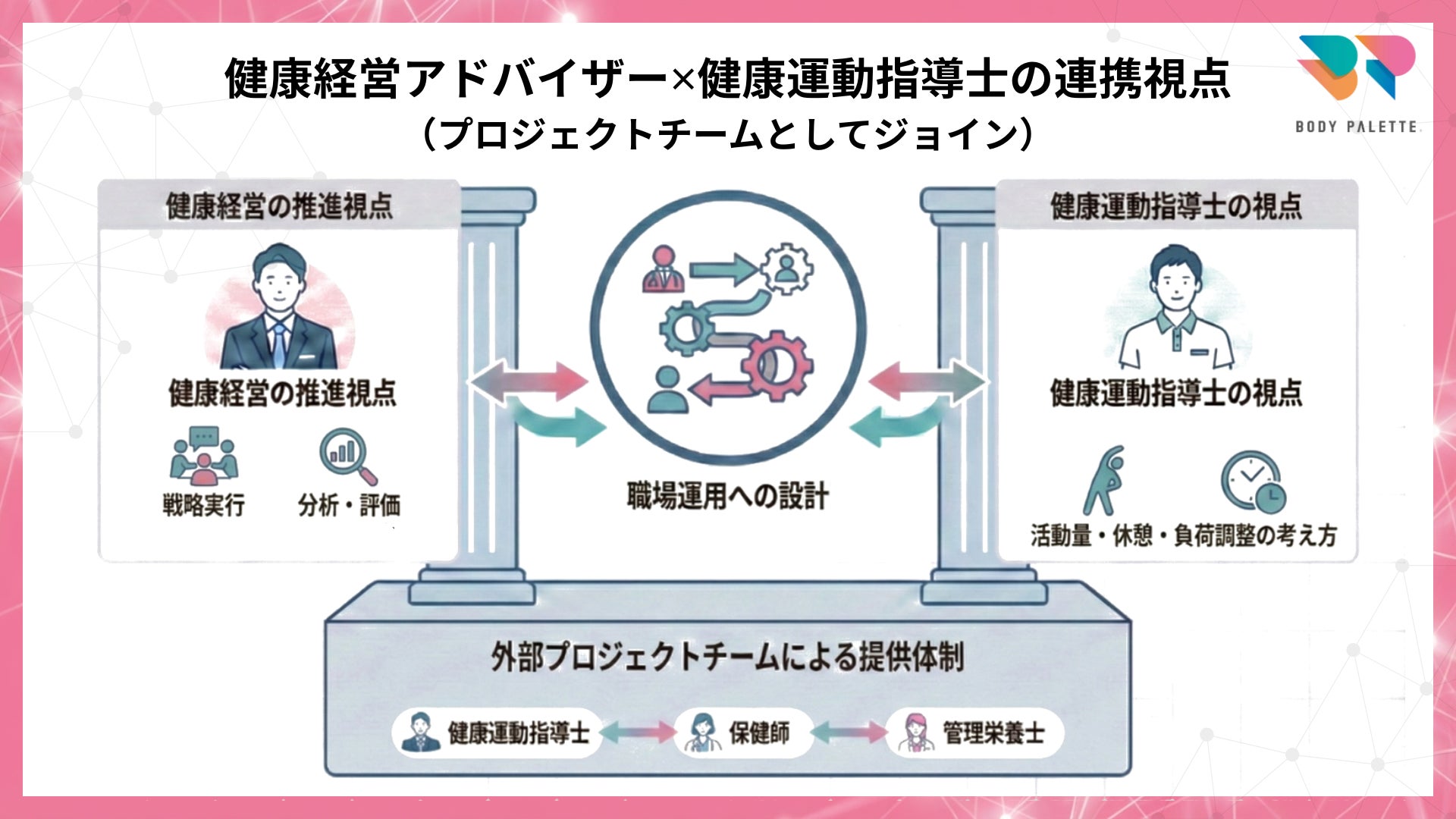 当社は、健康運動指導士・保健師・管理栄養士と連携し、社内に専任の推進チームがない企業でも、外部プロジェクトチームとしてジョインできる体制を想定しています。