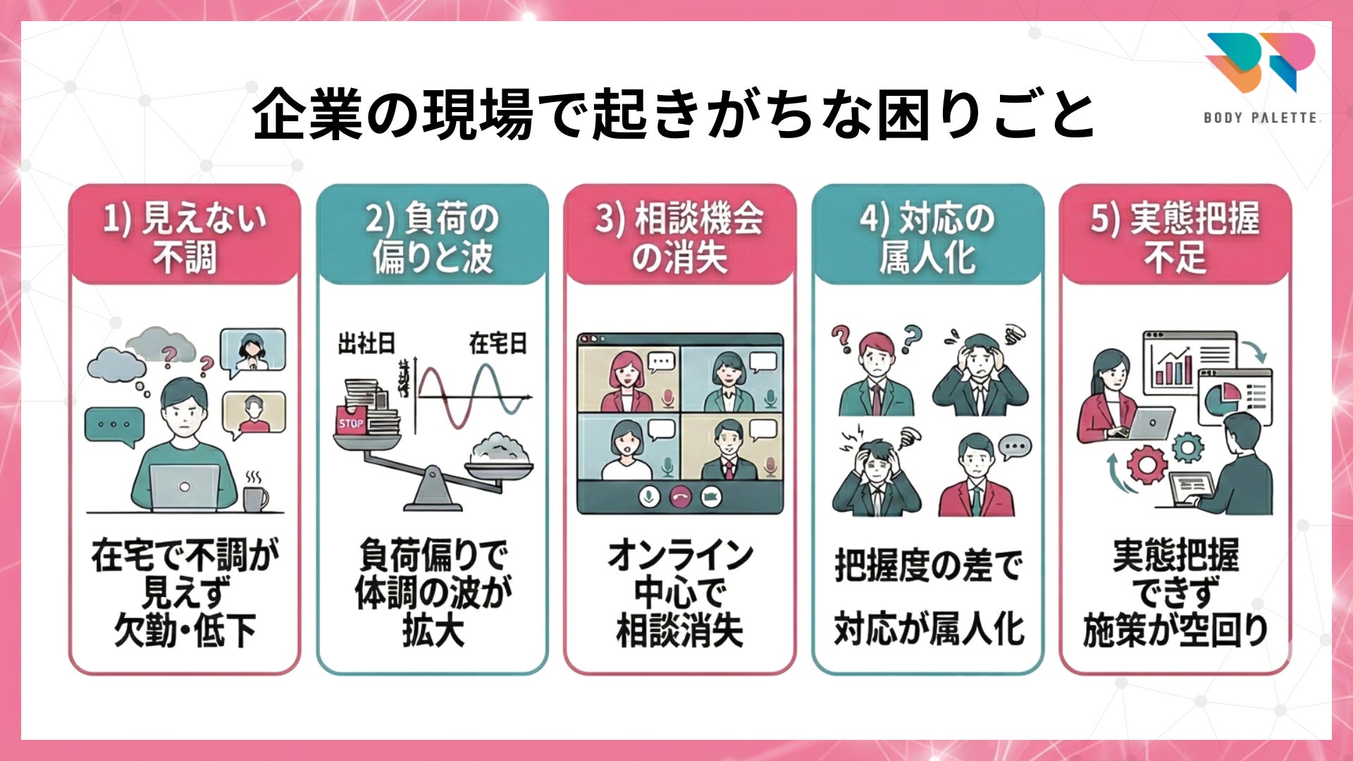 女性の健康課題はセンシティブ情報を含むため、なおさら「現場で回る運用設計」が重要になります。