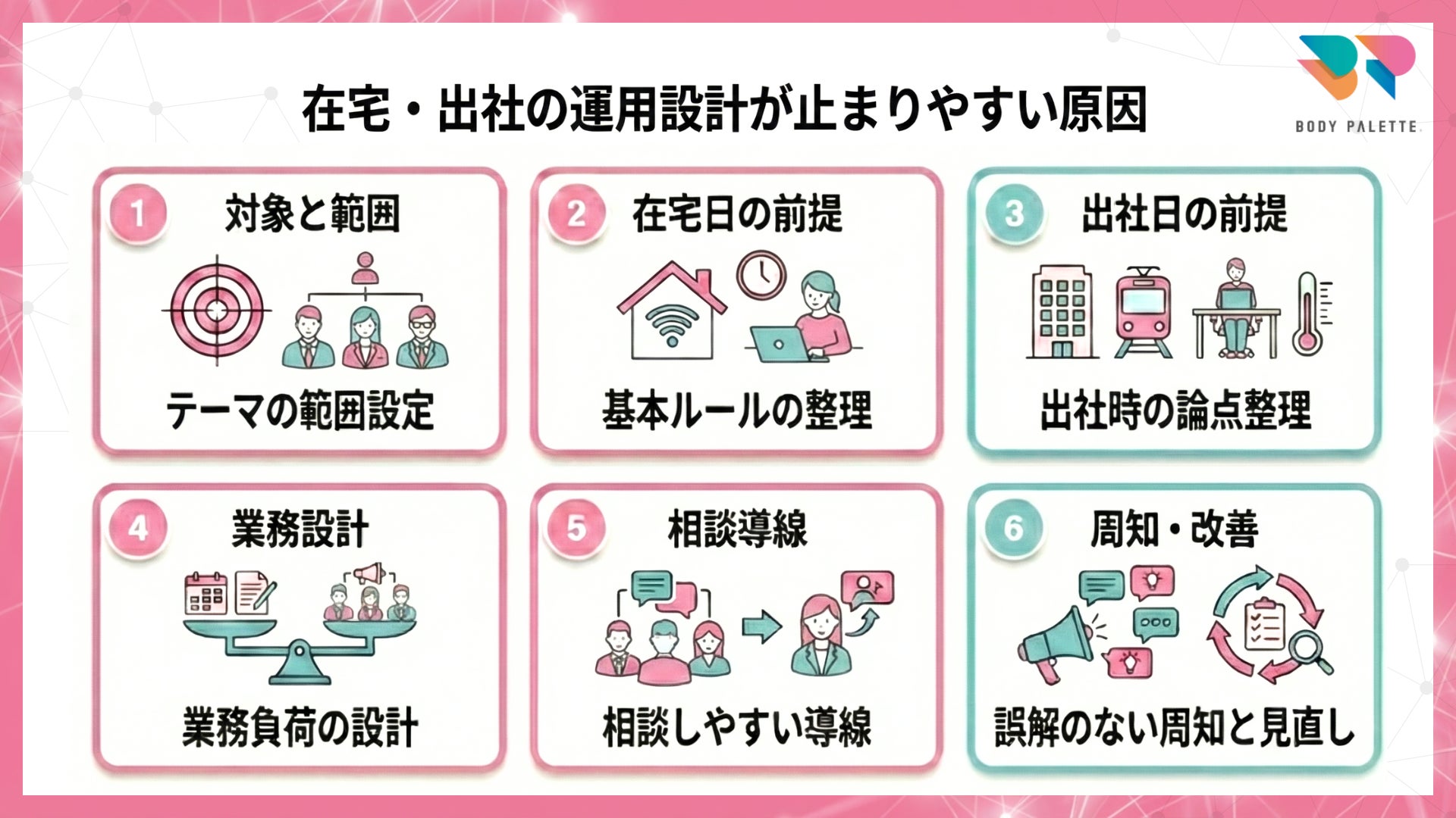 在宅・出社の運用設計が止まりやすい原因(人事・総務が整理すべき論点)