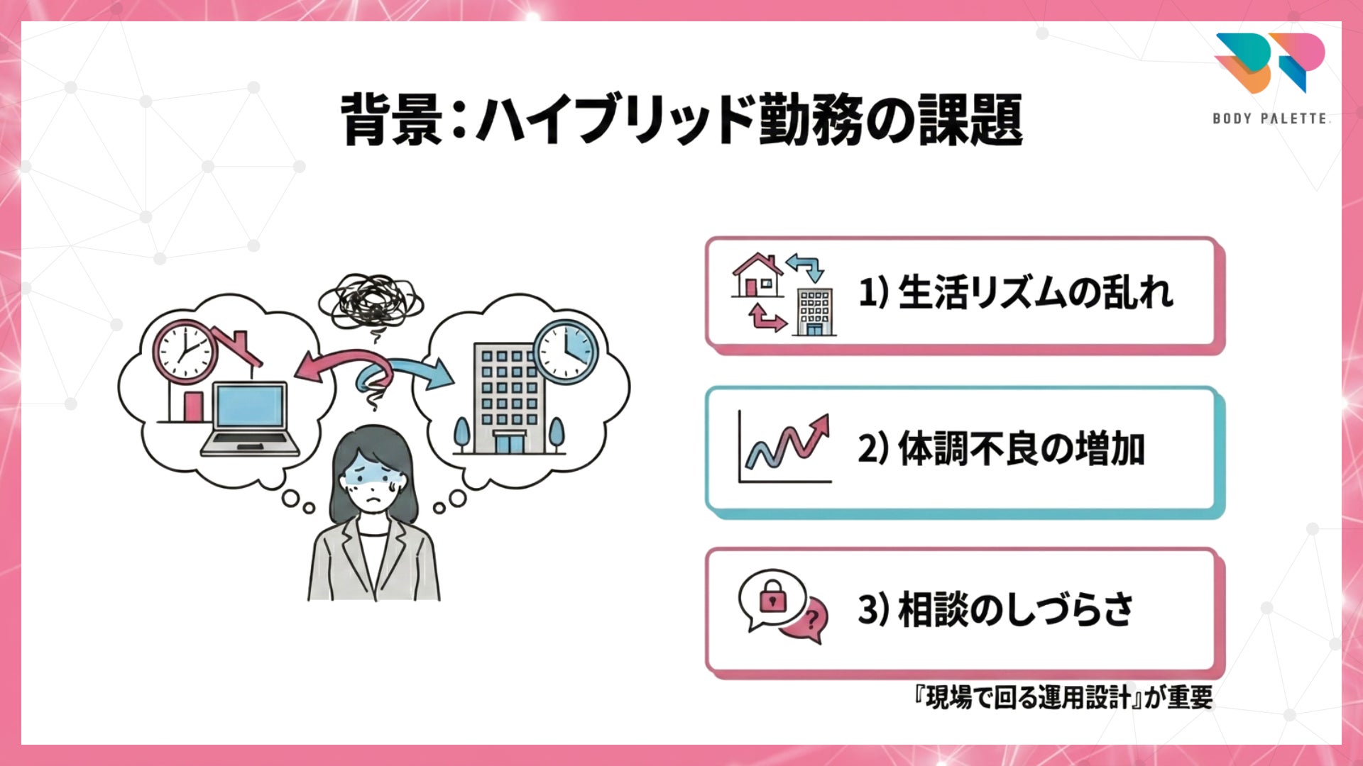 ハイブリッド勤務下のコンディション支援は、個人の努力に寄せるほど継続しません。