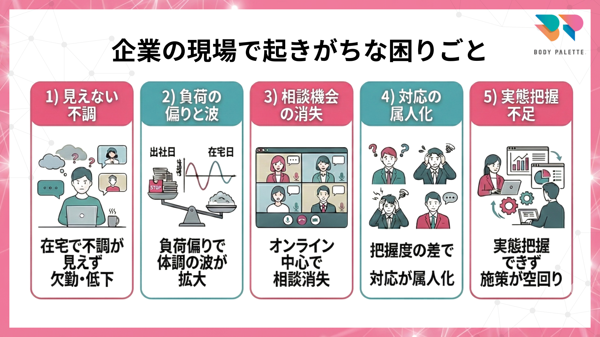 ・在宅の日ほど不調が表に出ず、急な欠勤やパフォーマンス低下として後から顕在化する