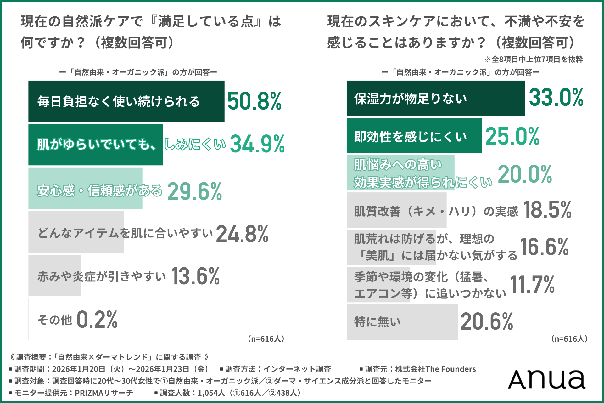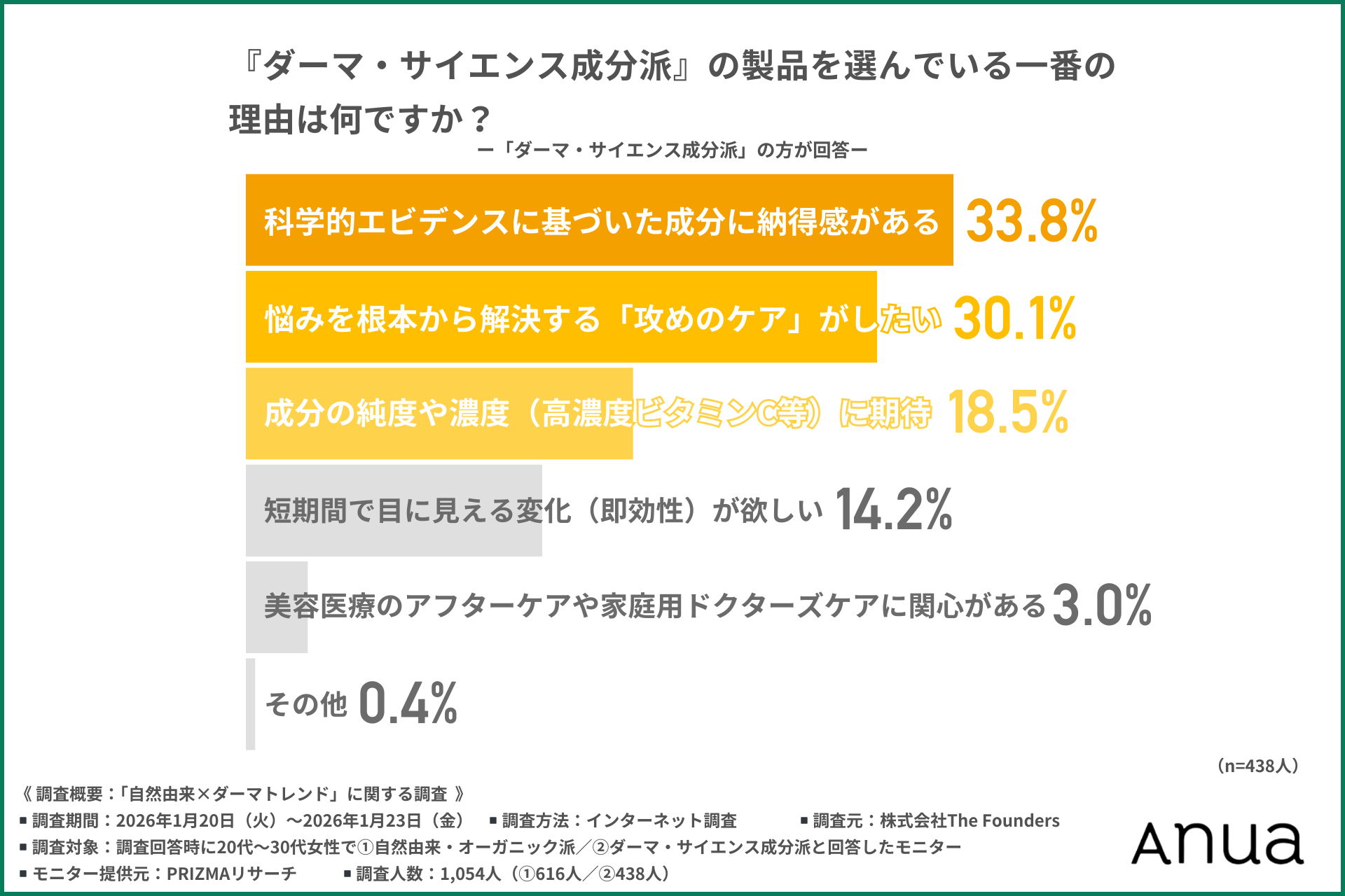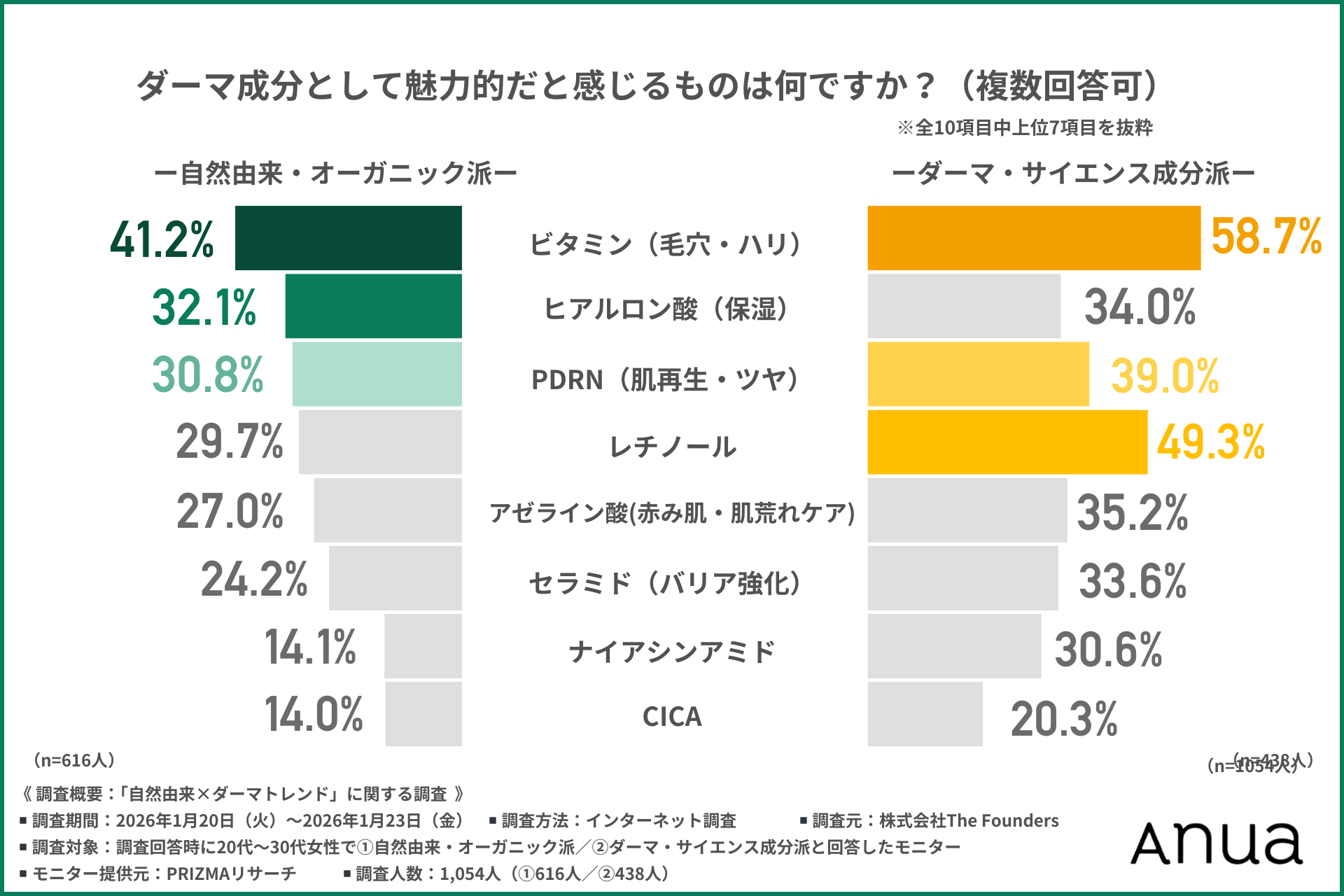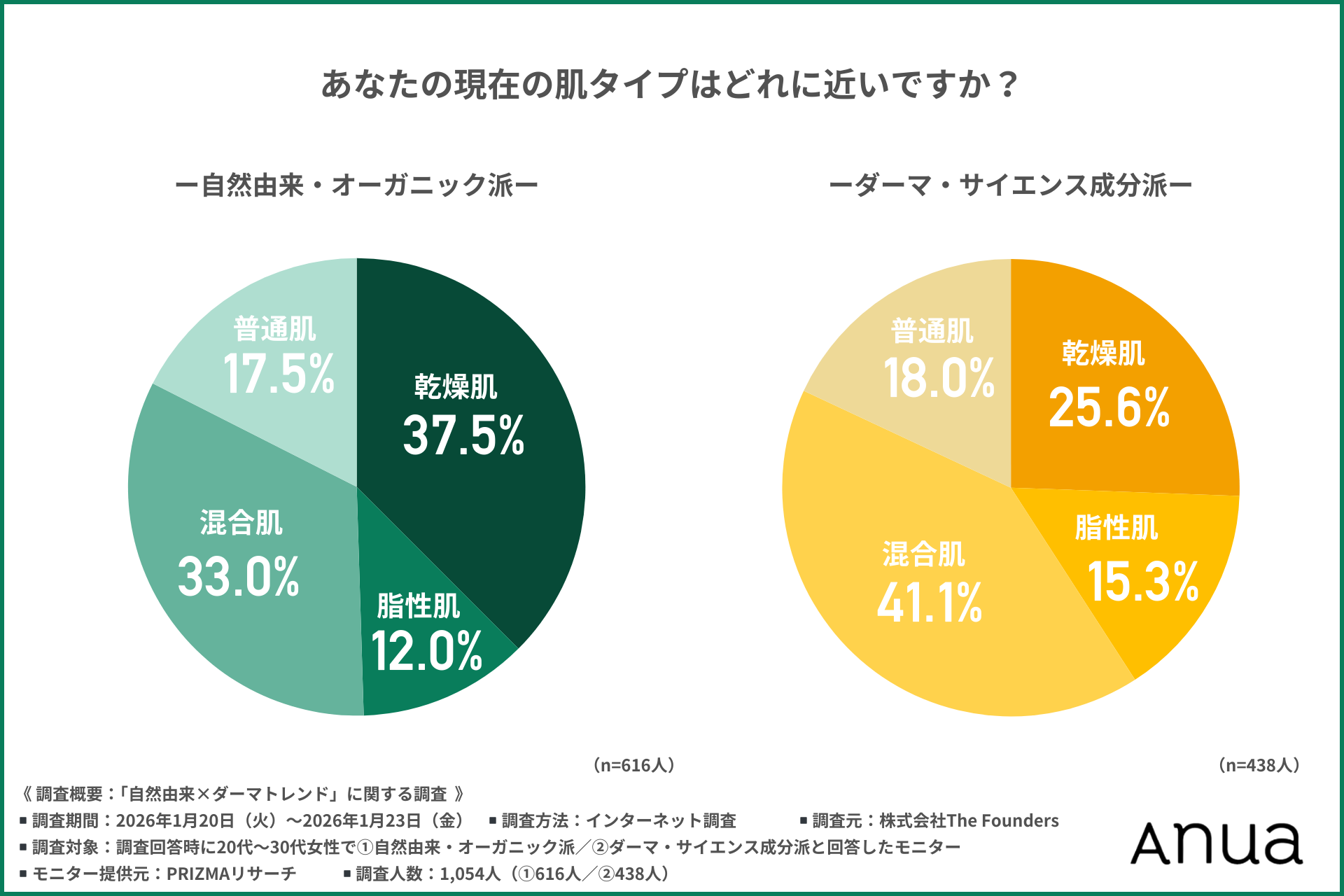 株式会社The Foundersが販売する化粧品ブランド「Anua(アヌア)」(https://anuashop.jp/)は、20代~30代女性で①自然由来・オーガニック派/②ダーマ・サイエンス成分派の方を対象に、「自然由来×ダーマトレンド」に関する調査を実施しました。