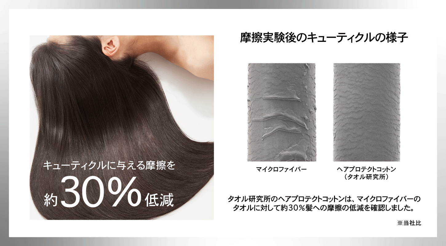 本製品は、タオル研究所として初の美容領域に向けた研究開発商品です。日常のヘアケアにおいて見過ごされがちな「タオルドライ時の摩擦」に着目し、ヘアダメージを軽減する特殊加工を施した、ヘアプロテクトコットンを採用しております。