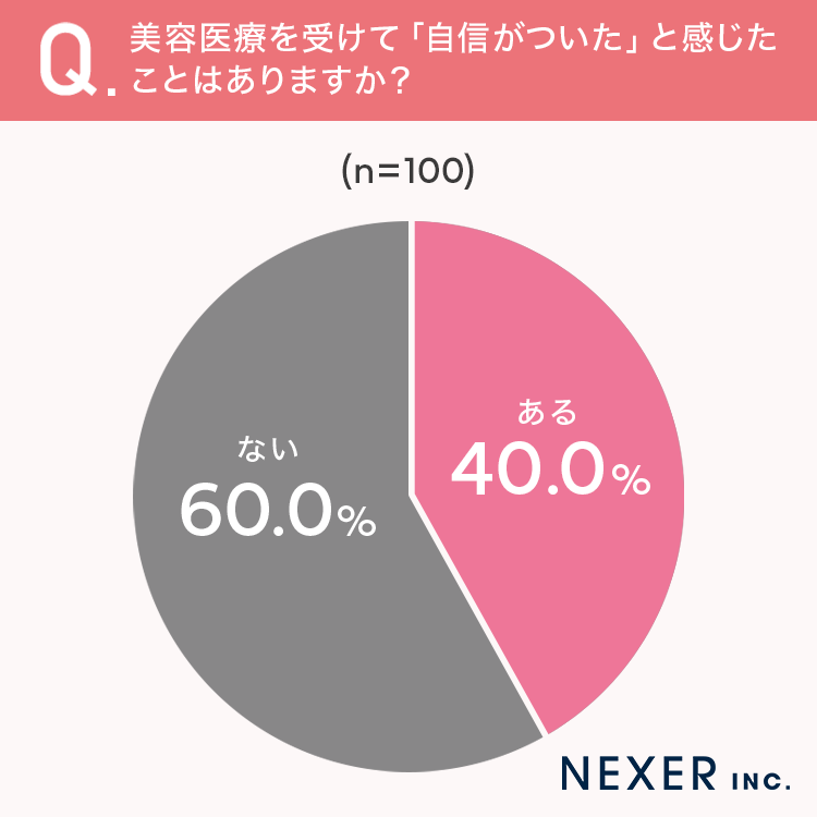 「ある」と回答した方は40%でした。美容医療に興味がある方のうち、4割が実際に施術を受けて自信につながったという実感を持っていることがわかります。