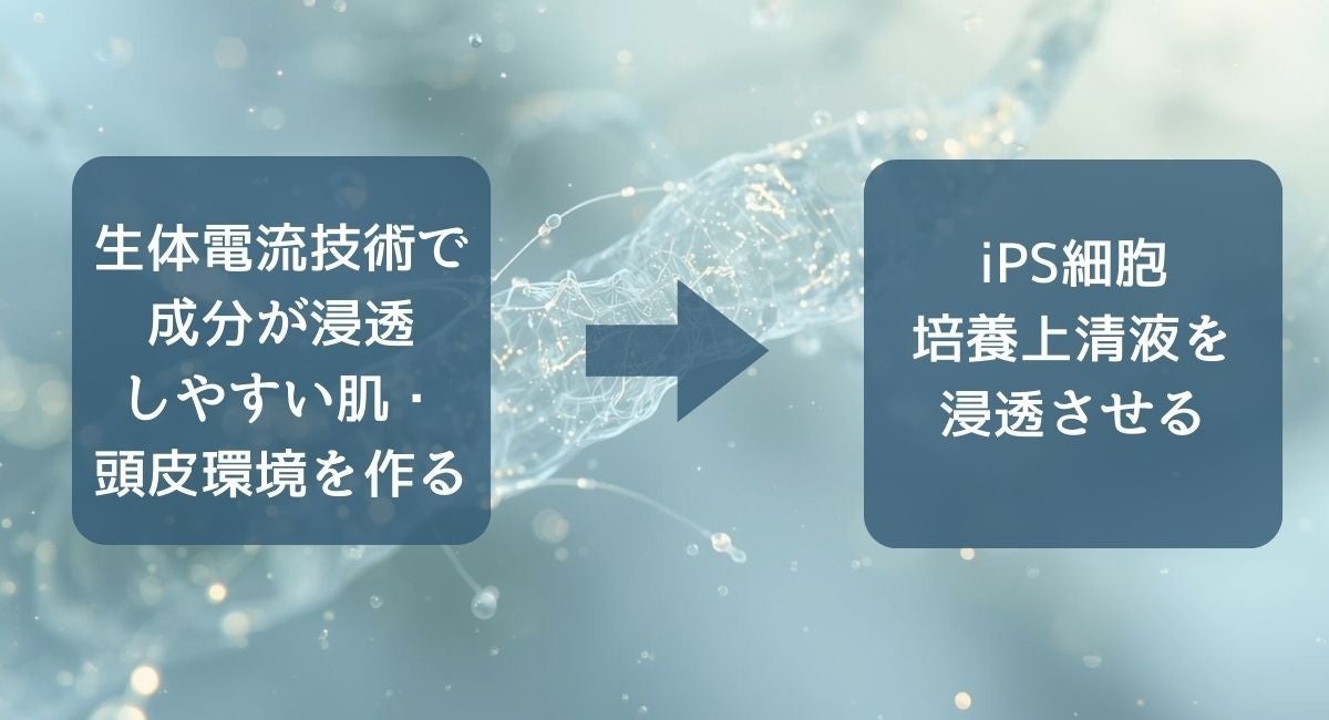 ▲ 生体電流技術とiPS細胞培養上清液を掛け合わせた、ヘアケア・スキンケアへのメリット