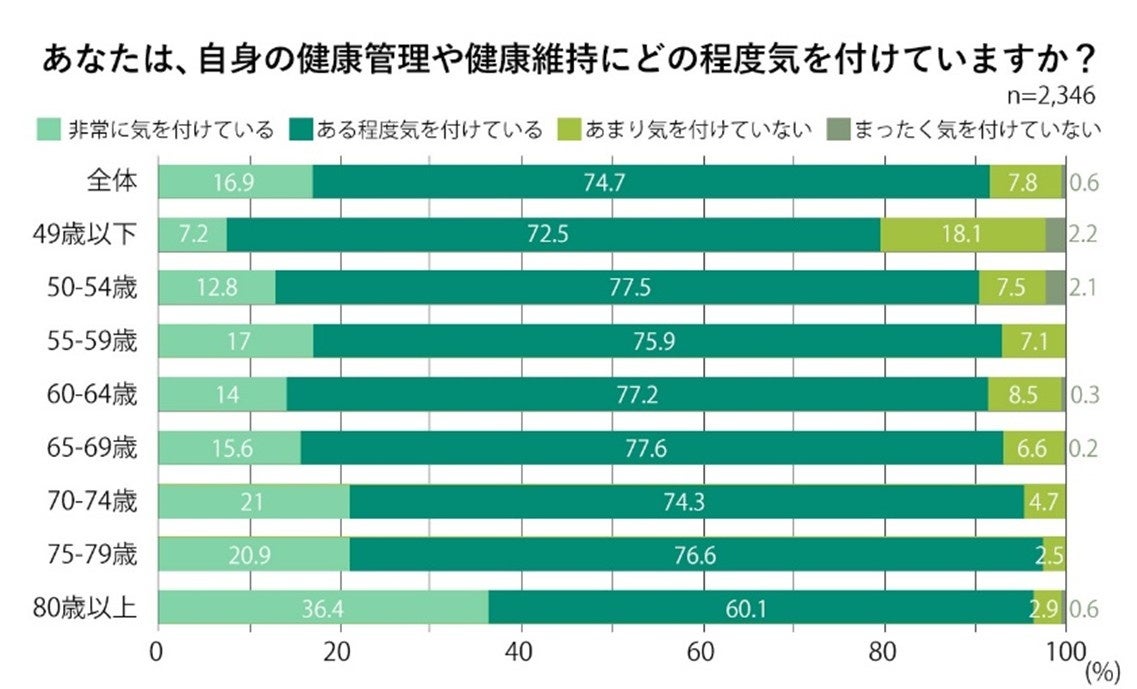 健康管理や健康維持にどの程度気を付けているかについては、「非常に気を付けている」16.9%と「ある程度気を付けている」74.7%と、合計91.6%の人が「気を付けている」と回答しました。70歳以上は「非常に気を付けている」が20%を超え、80歳以上では約36%とさらに増えていました。