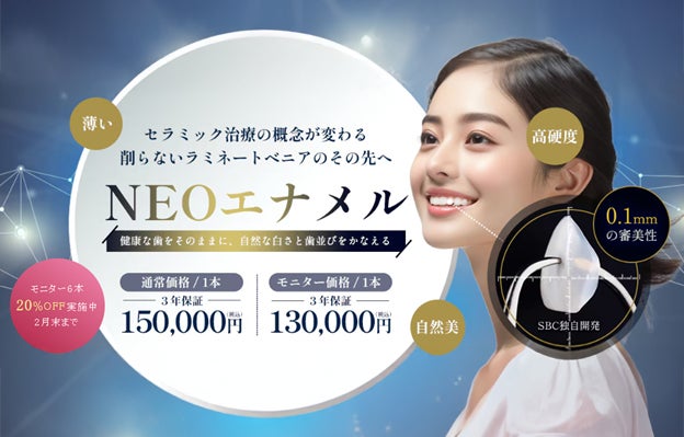 今回の調査結果からは、審美歯科治療において、自然な仕上がりを重視し、健康な歯はできるだけ守りたいと考える姿勢が、依然として多いことが改めて確認されました。 SBCメディカルグループが経営支援を行う湘南歯科クリニックでは、歯の削合量を抑えつつ、審美性と耐久性の両立を目指す治療の選択肢として、次世代ラミネートベニア「NEOエナメル」を提供しています。極薄のジルコニア素材を歯の表面に貼り付ける治療法で、自然な透明感やツヤ、高い耐久性を備えている点が特長です。前歯だけでなく奥歯やブリッジにも対応し、比較的短期間(最短2回の施術)で治療が完了しやすい点も特徴のひとつです。