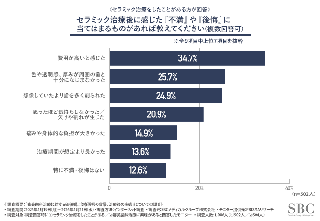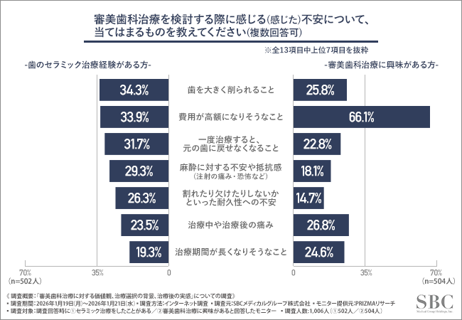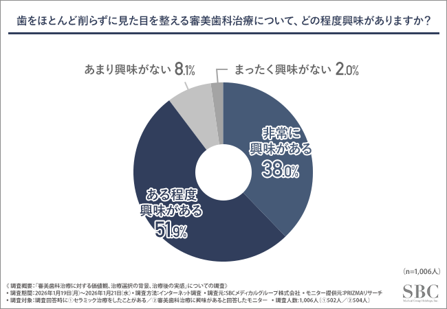 SBCメディカルグループホールディングス(所在地:米国カリフォルニア州、CEO:相川 佳之)の連結子会社であり、医療機関への経営支援事業を展開するSBCメディカルグループは、①セラミック治療をしたことがある方502名、②審美歯科治療に興味がある方504名を対象に、審美歯科治療に対する価値観、治療選択の背景、治療後の実感について調査を実施しました。