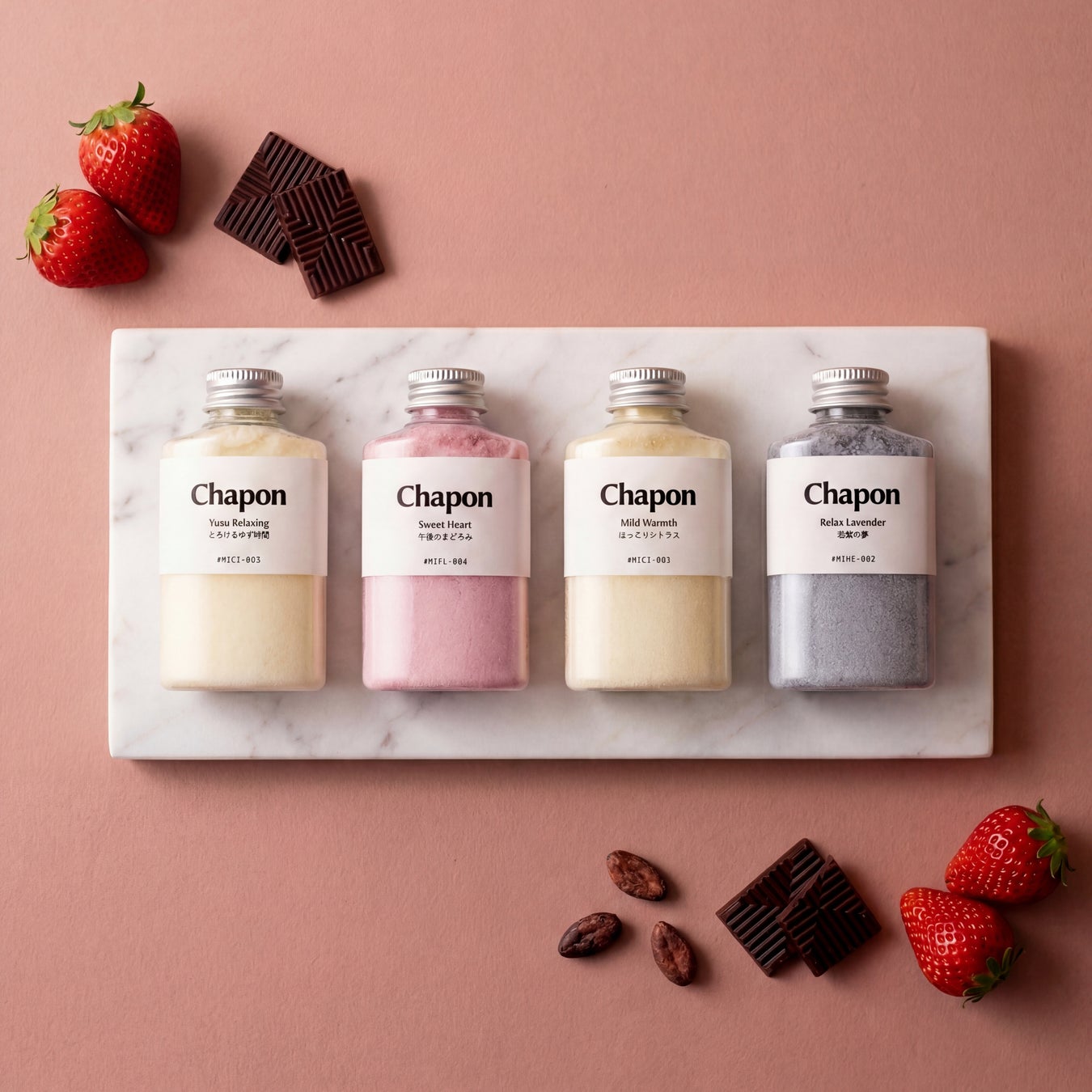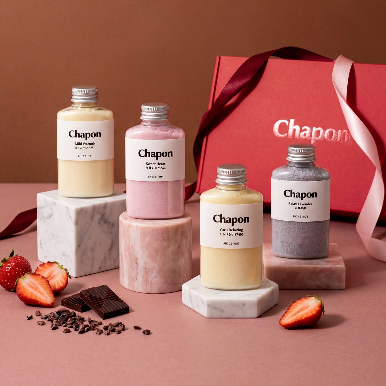 Chaponでは、バレンタイン限定ギフトの発売にあわせ、期間限定キャンペーンを実施いたします。対象期間中に、4本セットを4箱ご購入いただいたお客様へ、現在は一般販売されていない特別な入浴剤セットを1箱無料でプレゼント。贈り物としてはもちろん、 自分自身へのご褒美としてもお楽しみいただける、 このキャンペーン限定の特別なセットです。