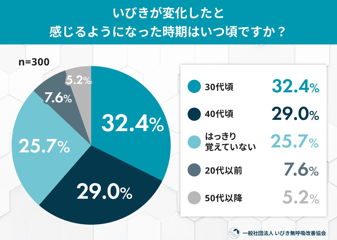 いびきの変化を感じ始めた時期は「30代頃」32.4%、「40代頃」29.0%
