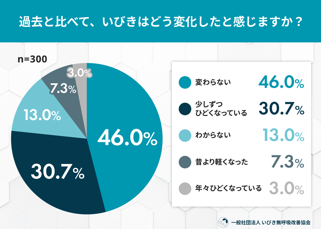 睡眠中に生じる「いびき」は、日常的な現象として軽視されやすい一方で、加齢や生活習慣の変化とともに悪化するのではないかと不安を抱く人も少なくありません。一般社団法人 いびき無呼吸改善協会は、20〜60代の男女300名を対象に、「いびきの体感変化」に関する調査を実施しました。その結果、強い自覚がない人が多い一方で、30〜40代を中心に“少しずつ変化している”と感じる層が一定数存在することが明らかになりました。いびきの変化を感じ始めた時期や、その背景にある要因、医師・専門家への相談意識などを通して、いびきを取り巻く実態を読み解きます。