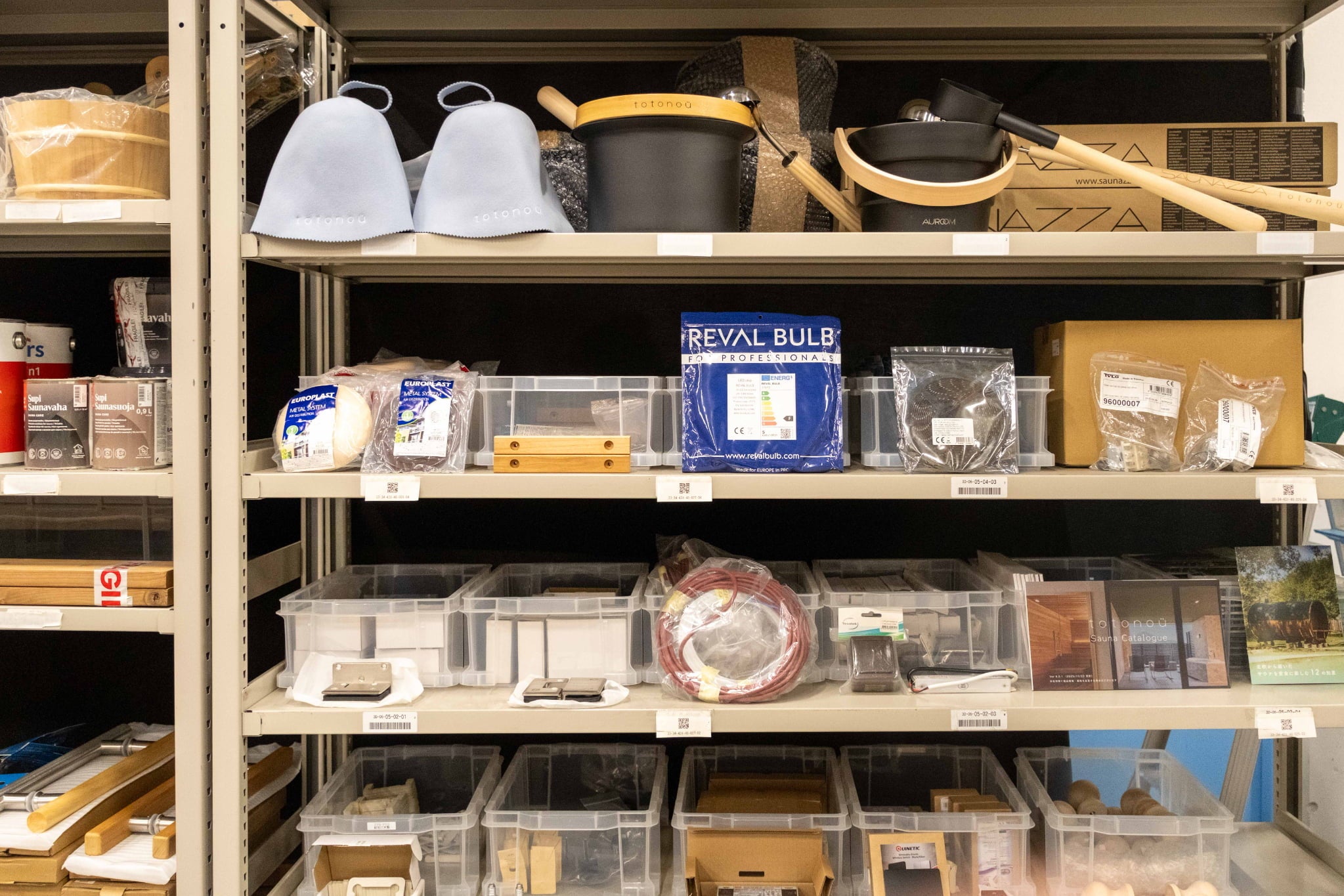 さらに、倉庫内にはサウナ本体だけでなく、サウナのスペアパーツやストーブ、ラドルや温湿度計などの付属品の在庫もずらり。木村の解説を聴きながら様々なパーツが並ぶ区画を見てまわり、高橋さんからも「安心」というコメントをいただきました。