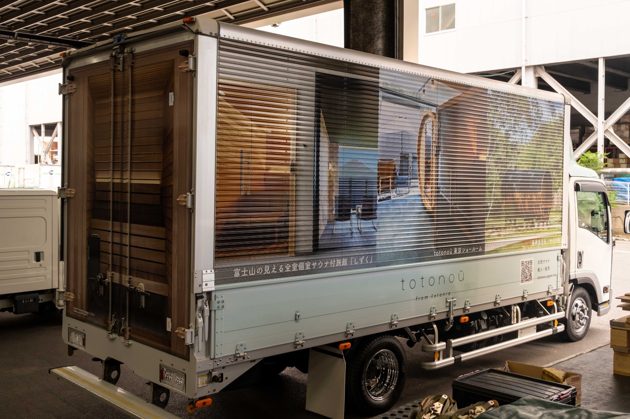 お客様のもとへ送り出されるサウナとともにエレベーターで1階へ降りると、目の前に『totonoü サウナトラック』が登場!側面や背面にtotonoüのサウナの写真が大きくプリントされたトラックを見て、驚きの声をあげます。
