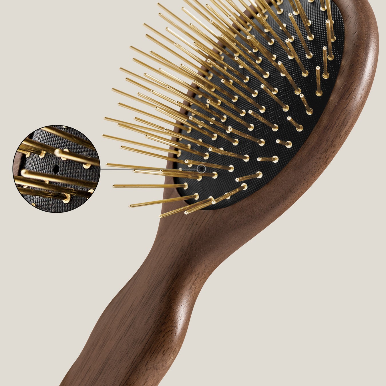 台湾の伝統職人による手仕事(ハンドクラフト)で、一つひとつ丁寧に仕上げられています。ウォルナットハンドルの曲線は持ちやすく、頭皮にしっかりと当たる24Kゴールドピンが心地よい刺激を与えます。
