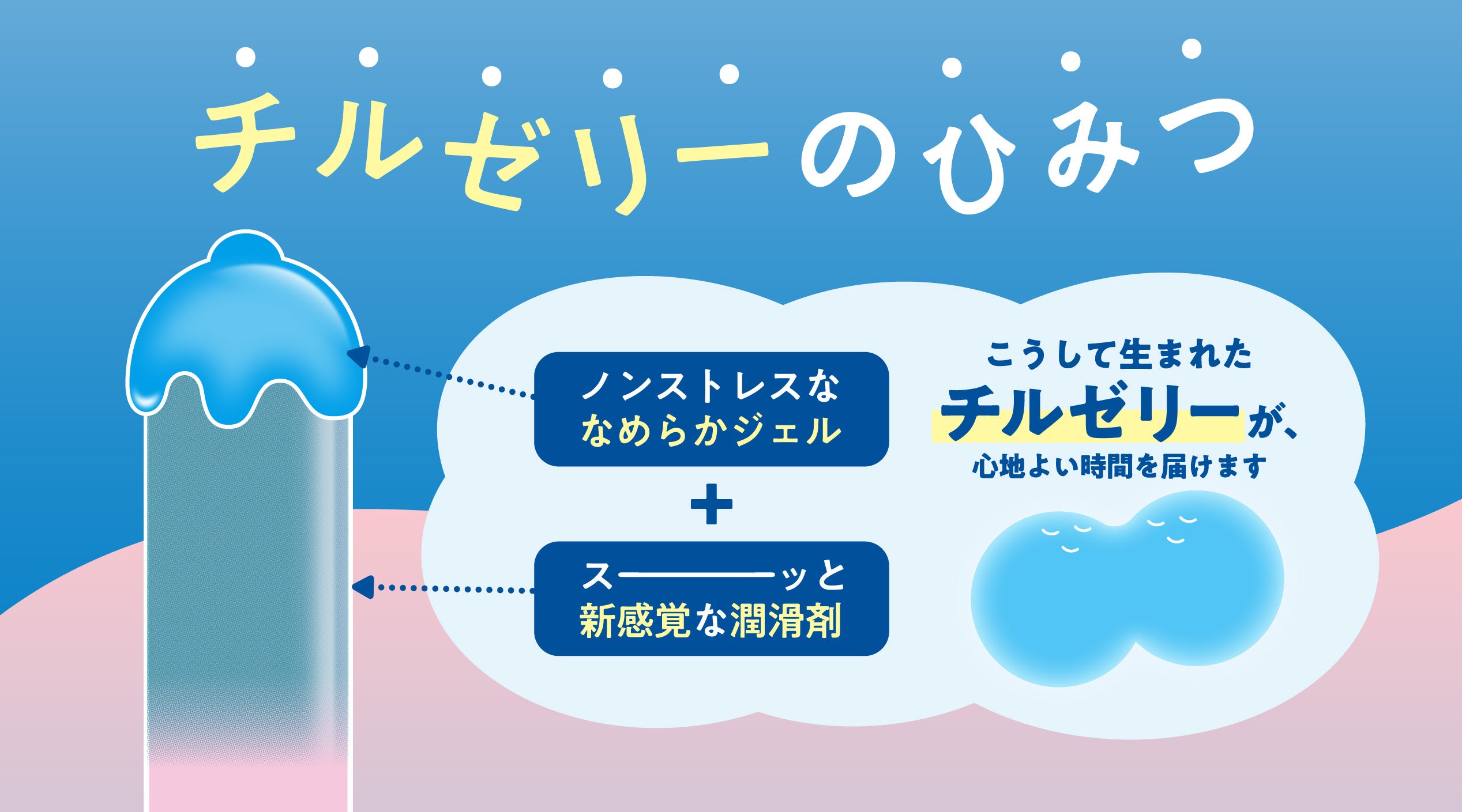 Chillcon最大の特長は、スーッとした爽快感と、なめらかな使用感を両立した独自開発の潤滑剤“チルゼリー”。装着時から使用中にかけては、ノンストレスでなめらかなジェルが自然な一体感をサポートします。さらに使用後には、ほんのりとした爽快感が広がり、高まった気持ちをやさしくクールダウンさせる新感覚の使用体験へ。