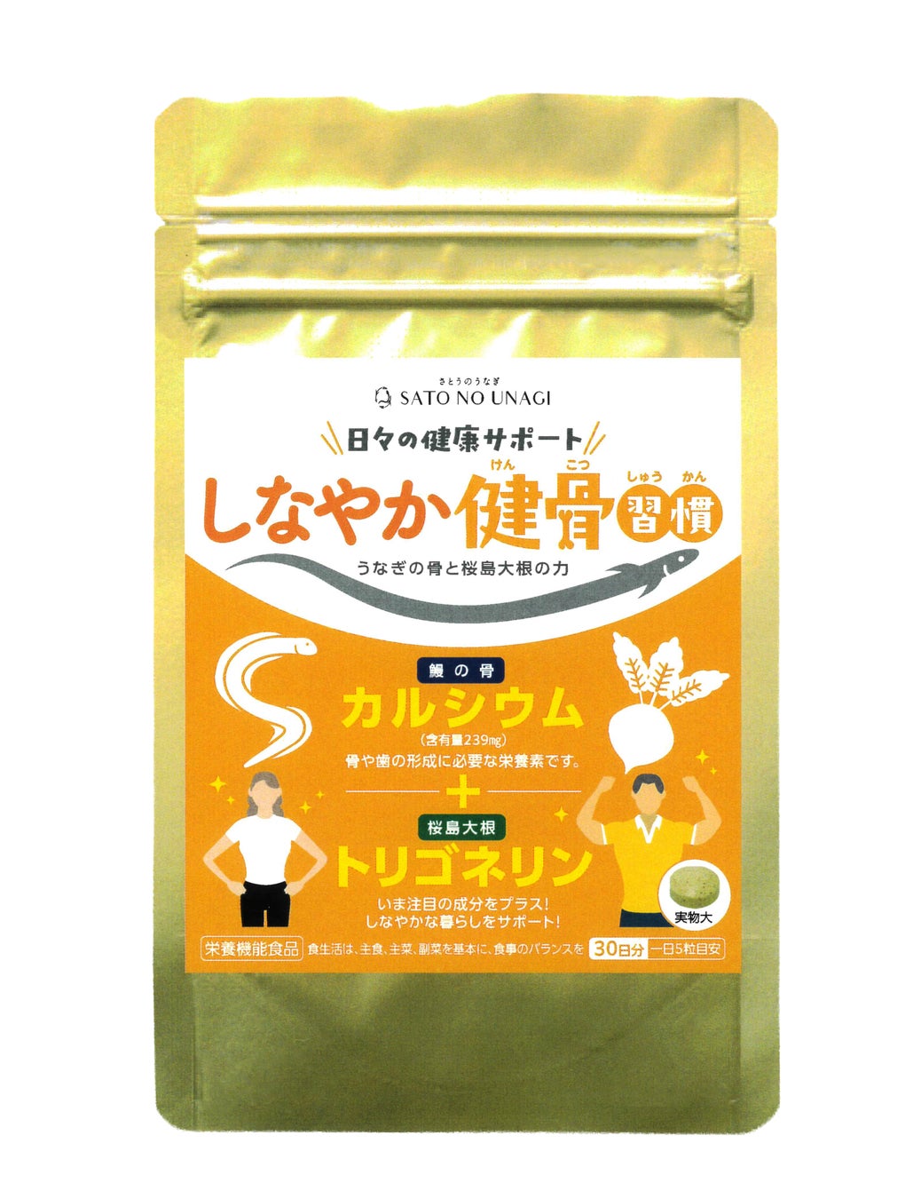 そのうなぎの骨を有効活用した九州産うなぎの骨由来カルシウムと、 桜島大根由来成分を組み合わせた、日本初※の栄養機能食品〈カルシウム〉サプリメント「しなやか健骨習慣」を発売します。 地域資源を活かしたものづくりを通じて、「しなやかで、健やかな毎日に」寄り添う商品です。