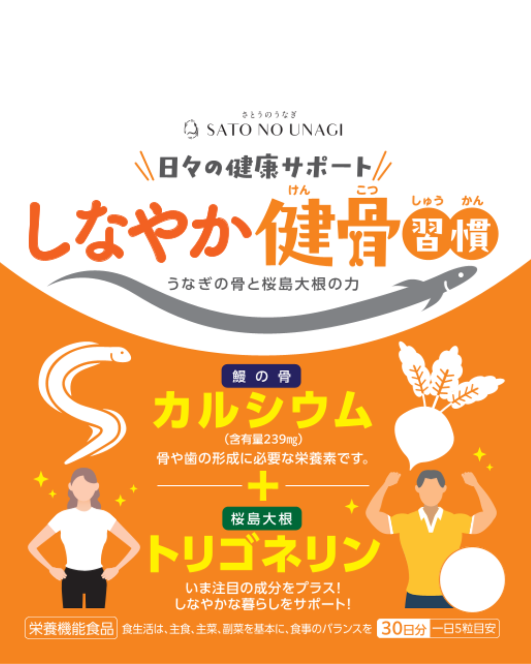そのうなぎの骨を有効活用した九州産うなぎの骨由来カルシウムと、 桜島大根由来成分を組み合わせた、日本初※の栄養機能食品〈カルシウム〉サプリメント「しなやか健骨習慣」を発売します。 地域資源を活かしたものづくりを通じて、「しなやかで、健やかな毎日に」寄り添う商品です。