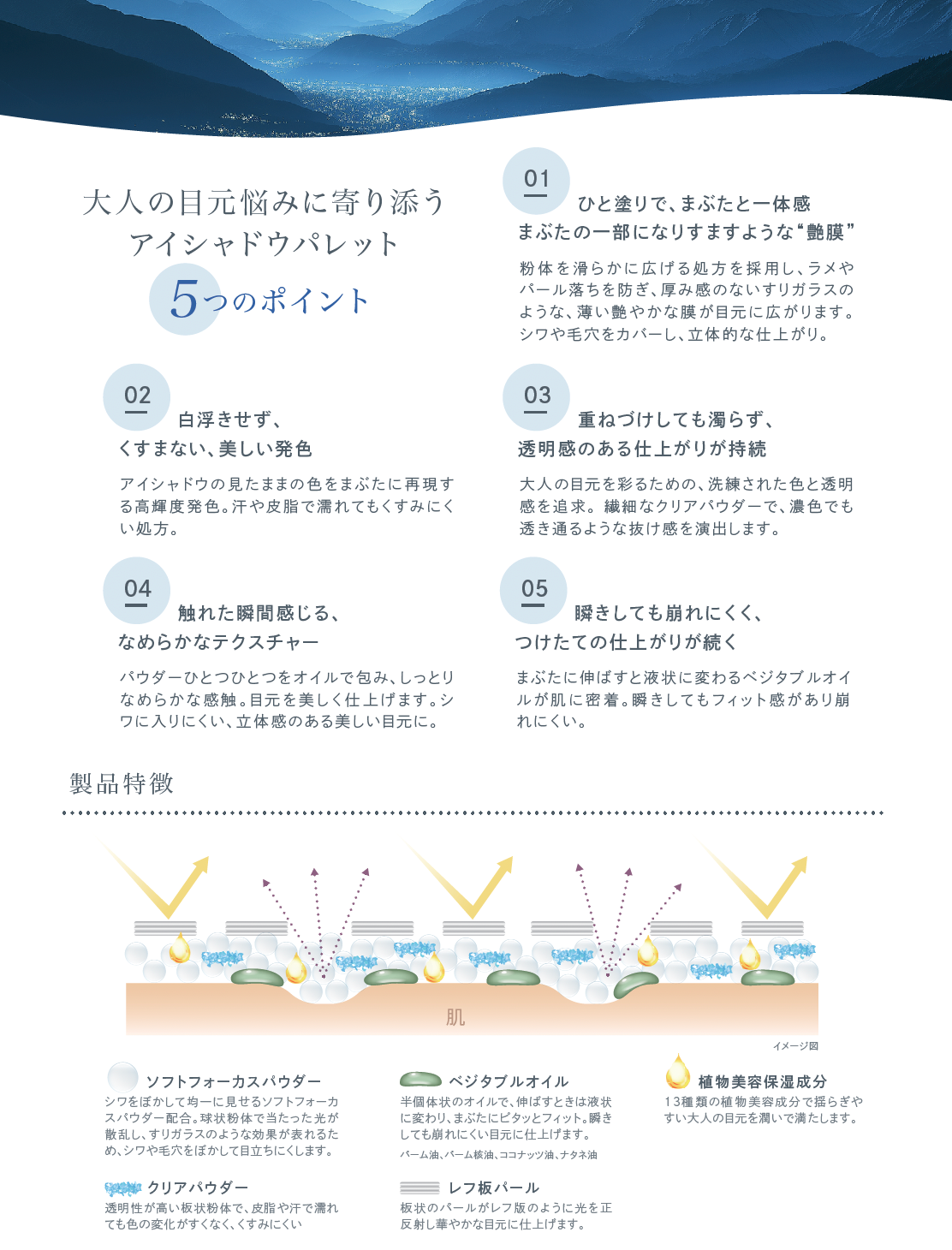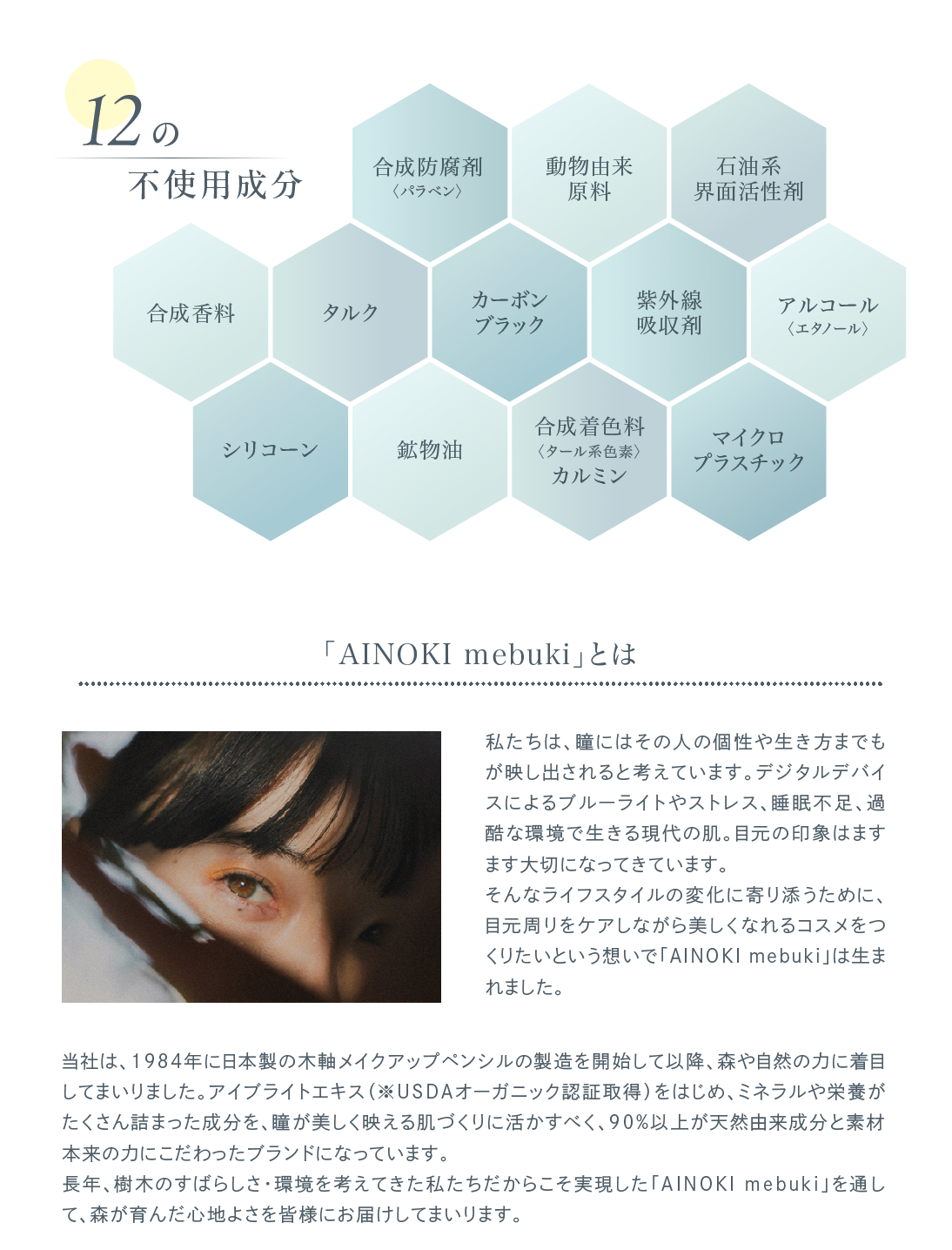 瞳が美しく映える肌の為に必要な成分を配合。敏感肌の人でも心地よく使えるように、天然由来成分90%以上、フリー処方などブランド独自の基準を設け自然や動物にも優しいブランドを目指しています。