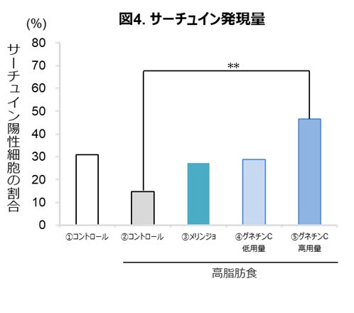 高脂肪食モデルにグネチンCを摂取させた結果、グネチンCを摂取させていない群と比較して、肝臓中のサーチュインの発現量(図4)と血中のFGF21(図5)の分泌量が有意に増加しました。また、試験管試験で、グネチンCはサーチュインに直接結合することで活性を高め、その活性はレスベラトロールよりも高いことが明らかになりました(図なし)。
