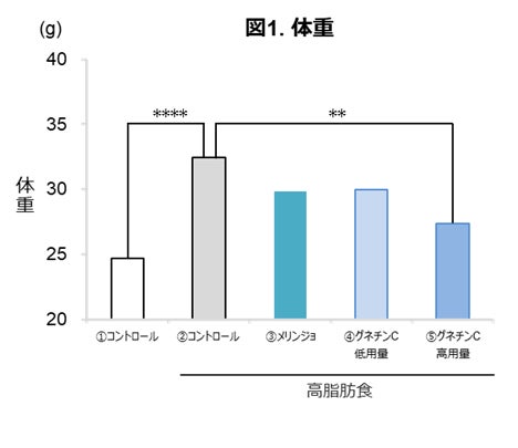 健康なモデルを5群に分け、2群には、①通常食(コントロール群)、➁高脂肪食(コントロール(高脂肪食)群)を10週間、3群には、高脂肪食を6週間摂取させ、肥満および高血糖にした後に、高脂肪食とともに③メリンジョ種子エキス 1,000 mg/kg/日(メリンジョ群)、④グネチンC 100 mg/kg/日(グネチンC低用量群)、⑤グネチンC 200 mg/kg/日(グネチンC高用量群)を4週間、それぞれ与えました。10週間後に、体重測定や採血、組織検査を行いました。