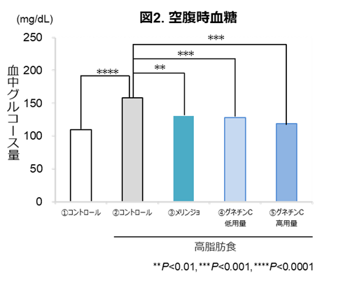 高脂肪食モデルにグネチンCを摂取させた結果、グネチンCを摂取させていない群と比較して、体重(図1)と空腹時血糖(図2)が有意に低下しました。また、総脂肪、皮下脂肪、内臓脂肪の面積ならびに、肝臓の脂肪面積が有意に減少しました(図なし)。