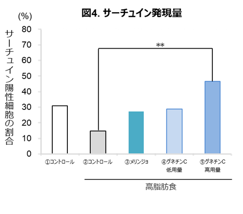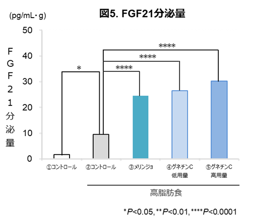高脂肪食モデルにグネチンCを摂取させた結果、グネチンCを摂取させていない群と比較して、肝臓中のサーチュインの発現量(図4)と血中のFGF21(図5)の分泌量が有意に増加しました。また、試験管試験で、グネチンCはサーチュインに直接結合することで活性を高め、その活性はレスベラトロールよりも高いことが明らかになりました(図なし)。