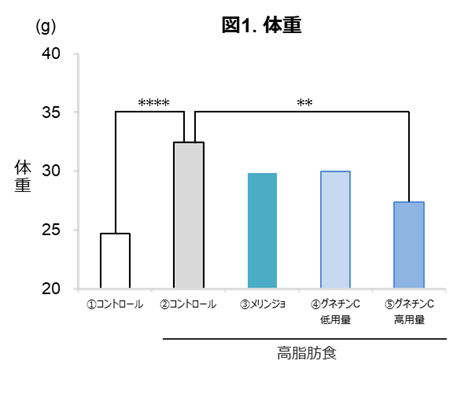 健康なモデルを5群に分け、2群には、①通常食(コントロール群)、➁高脂肪食(コントロール(高脂肪食)群)を10週間、3群には、高脂肪食を6週間摂取させ、肥満および高血糖にした後に、高脂肪食とともに③メリンジョ種子エキス 1,000 mg/kg/日(メリンジョ群)、④グネチンC 100 mg/kg/日(グネチンC低用量群)、⑤グネチンC 200 mg/kg/日(グネチンC高用量群)を4週間、それぞれ与えました。10週間後に、体重測定や採血、組織検査を行いました。