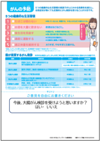大腸がんの現状や大腸がん検診・精密検査について解説した4枚のポスターを見て、5問の簡単なクイズに答えることで、大腸がん検診・精密検査受診の大切さを理解する仕組みになっており、毎年多数の自治体・企業等の健康イベントなどで活用されています。解答用紙には参加者の受診状況や検診に対する思いなどを話すきっかけとなるアンケートが記載されており、受診勧奨ができるようになっています。