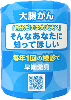 大腸がんの現状や大腸がん検診に関する説明を、イラスト入りでロール面に記載されています。大腸がん撲滅トイレットペーパーをトイレに設置して、トイレを利用した大腸がん検診の普及啓発に活用いただいたり、健康系のイベント等で配布し、持ち帰った市民の皆さんが家族で大腸がん検診についてトイレで学んでいただける資材です。