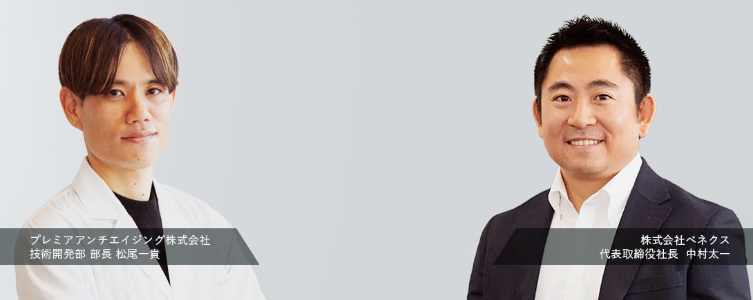 「R&D」コンテンツでは、研究開発に関する情報発信を強化してまいります。研究拠点、研究分野、技術開発情報のほか、プレミアアンチエイジング株式会社技術開発部 部長 松尾一貴と、株式会社ベネクス 代表取締役 中村太一の研究対談コンテンツも公開しています。