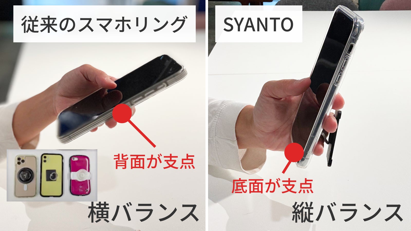 SYANTO独自の底面支持構造(特許取得)により、従来の背面にリングが付いている横バランスのスマホリングと比較し、縦バランスでスマホを支えるので、支点・力点の位置が変わります。