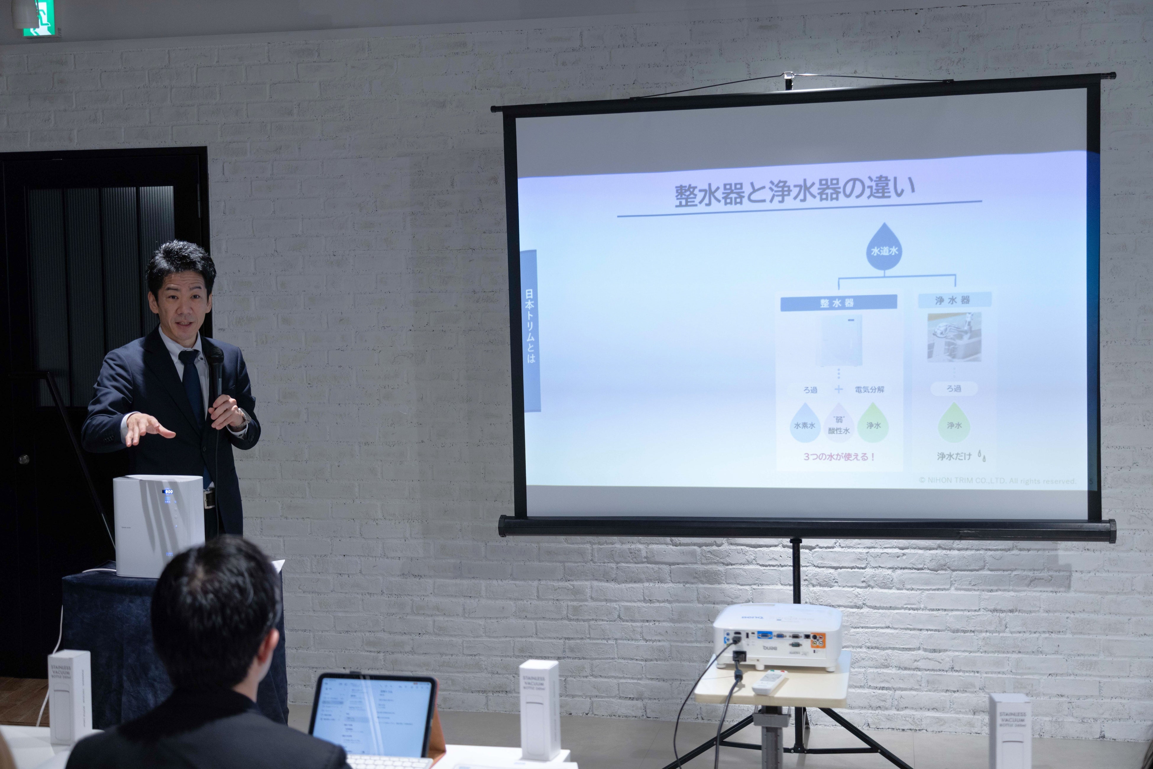 プレゼンテーションでは、水素の抗酸化性への関心の高まりを背景に、より高濃度の電解水素水を求めるお客様の声から誕生した「TRIM ION Refine」の独自技術について解説しました。あわせて、「電解水素水で炊飯をすると美味しい」といった実際の利用者の声も紹介され、日常生活の中で幅広く活用できる点や、高い機能性や汎用性が多くの支持を集めていることを伝えました。