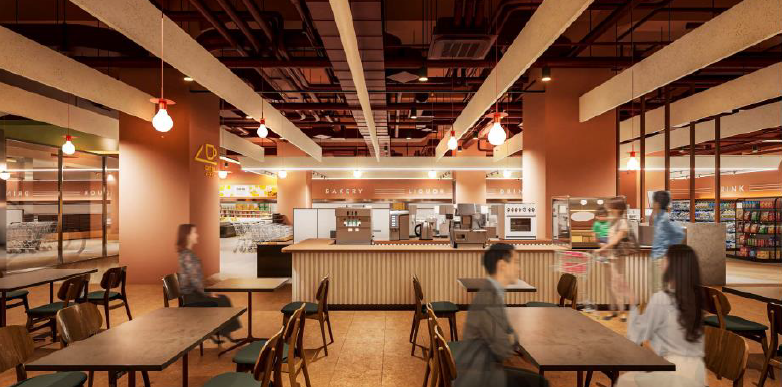 食品は地下1階と1階で展開。1階フロアの中央に、イートインコーナーを設置します。