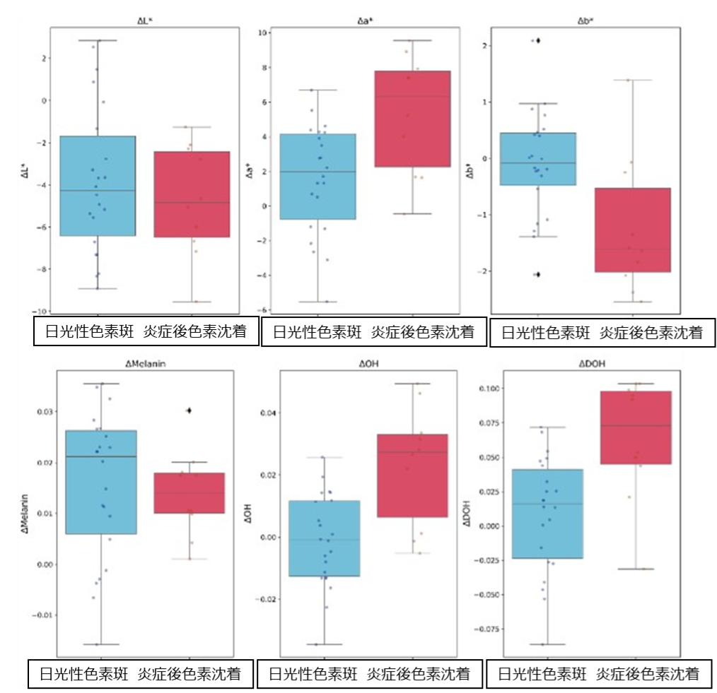 それぞれの色素斑の反射スペクトルを分析した結果、炎症後色素沈着は日光性色素斑に比べて、ヘモグロビン(ΔOHおよびΔDOH)の含有量が高く、また赤み(Δa*)が強く、黄み(Δb*)が弱いことがわかりました(図参照)。これは、炎症後色素沈着部位における血流増加に起因すると考えられます。炎症は通常、治癒過程における炎症部位の細動脈の拡張と血流増加によって引き起こされる発赤を伴うので、上記の測色学的HSI測定結果は、炎症後色素沈着に関連する基礎的な生化学反応を反映している可能性があります。
