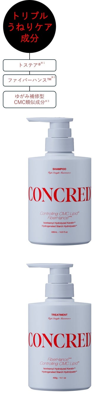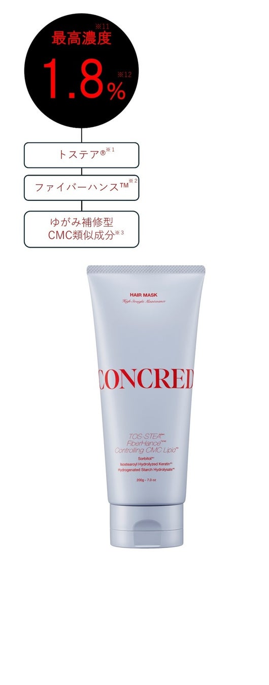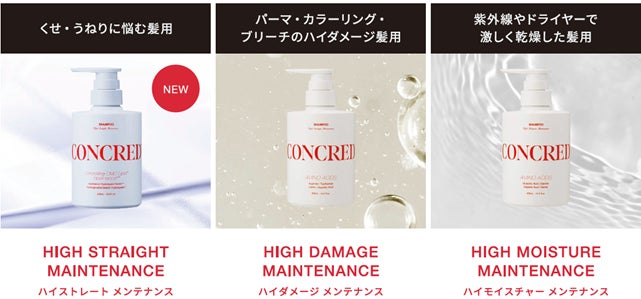 キューティクルのケアや補修など、髪の外側へアプローチする手法が多かったこれまでのヘアケア。しかしここ数年で毛髪研究が進み、髪の内部構造が解明されはじめました。CONCREDは、効果的なヘアケア開発のため、毛髪内部に着目し、商品開発を行っております。2025年4月に発売したハイダメージ メンテナンスシリーズ、ハイモイスチャー メンテナンスシリーズは、ダメージの種類によって流出するアミノ酸の種類が異なることに着目。流出した量以上のアミノ酸を配合することで、髪を補修して質感を整えることに成功しました。